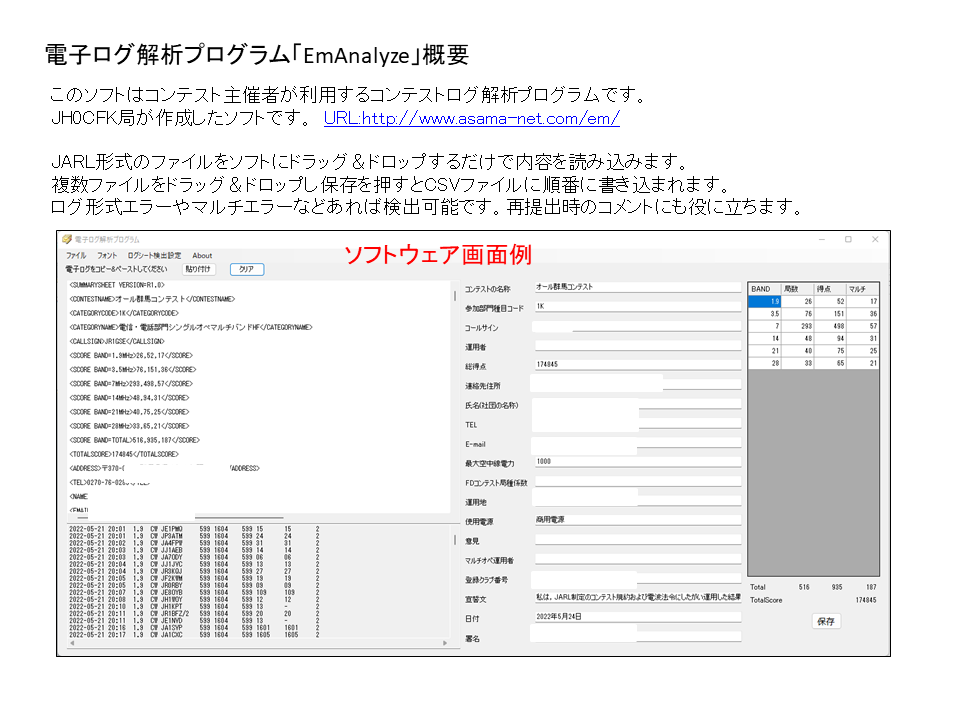 近年、電子ログの普及によりコンテストログ集計も電子化になってきています。しかし、コンテスト集計するソフトウェアは少なく、普及していないのが実際の現状ではないでしょうか。少しでも集計の負担を減らすために救世主となったのがJH0CFK局作の「EmAnalyze」電子ログ解析プログラムになります。