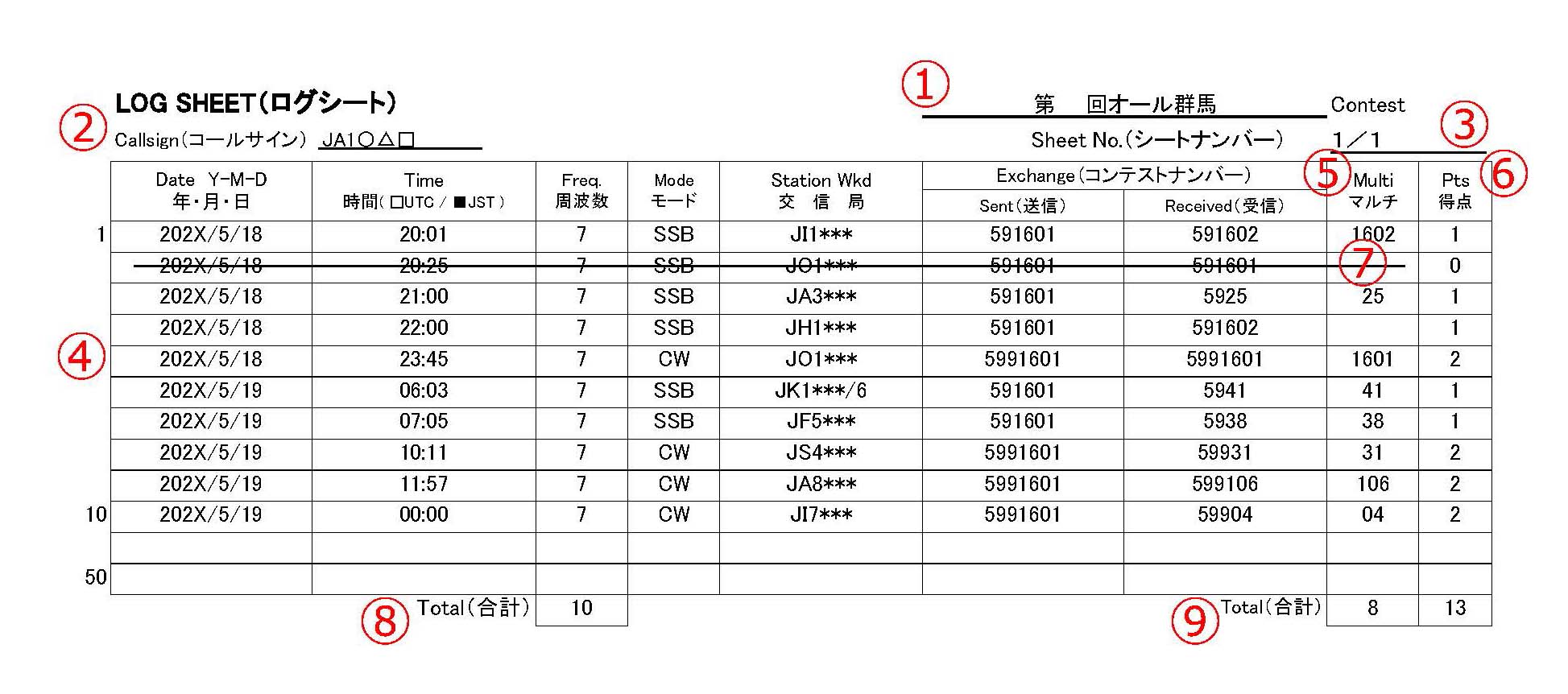 JARLの紙ログによる書類の様式の説明はJARLホームページのコンテストページの「ログ提出について」を併せてご覧ください。