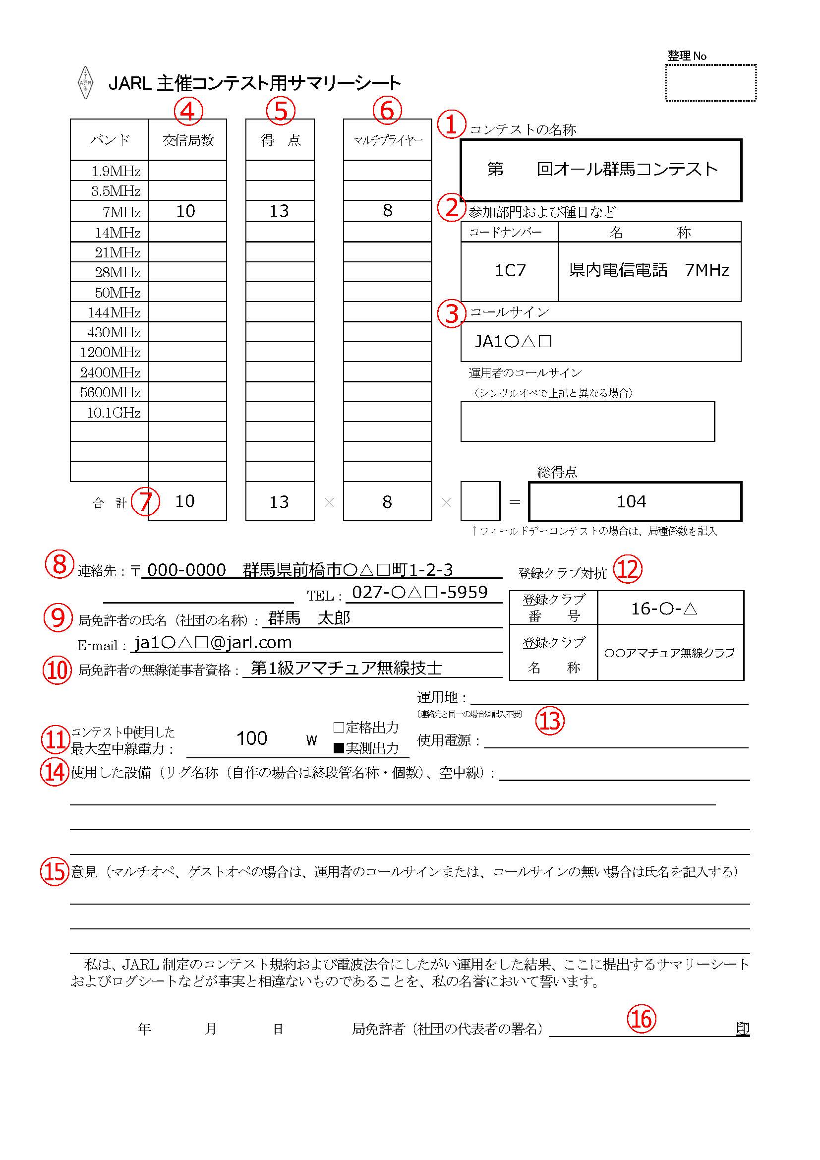 ① コンテストの名称:「第〇△回オール群馬コンテスト」と記入。 ② 参加部門及び種目:県内・外、部門・参加種目を記入。 (例)県内・シングルバンド7MHz電信電話の場合:コードナンバー「1C7」 名称「県内電信電話7MHz」 ③ コールサイン:移動運用した場合はコールサインの後に/移動エリアナンバーを記入。 (例):JA1〇△□/1 ④ 交信局数:ログシートから不確実な交信を除いた局数を記入。 ⑤ 得点:ログシートからバンド毎に得点を記入。 ⑥ マルチプライヤー:ログシートからバンド毎のマルチ数を記入。 ※重複した場合はカウントできません。 ⑦ 合計:⑤×⑥が総得点になります。 マルチバンドの場合は(各バンドの得点の和)×(各バンドのマルチプライヤーの和) ⑧ 連絡先:連絡用の住所です。郵便番号、住所、電話番号を正確に記入してください。 ⑨ 局免許者の氏名(社団の名称):免許人の氏名を記入。(社団の場合は、その名称) ⑩ 局免許者の無線従事者資格:無線従事者の資格を記入。 ⑪ 最大空中線電力:運用した空中線電力を記入。 ⑫ 登録クラブ対抗:群馬県内登録クラブのみ登録クラブ番号、クラブ名称を記入。 ⑬ 運用地:常置場所以外で運用した場合、その移動先を記入してください。 ⑭ 使用した設備:使用した設備を記入してください。 ⑮ 意見:意見欄にご意見があれば記入してください。 社団局は、運用者全員のコールサイン(または氏名)、従事者資格を記入してください。 ・ジュニア部門参加の方は学年を記入して下さい。(例)高校2年 小学校3年 ・シニア部門参加の方は年齢を記入してください。 ⑯ 提出日付を記入し署名してください。